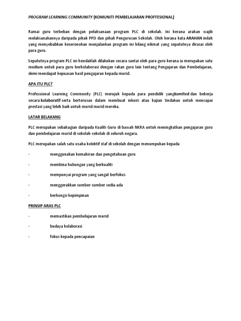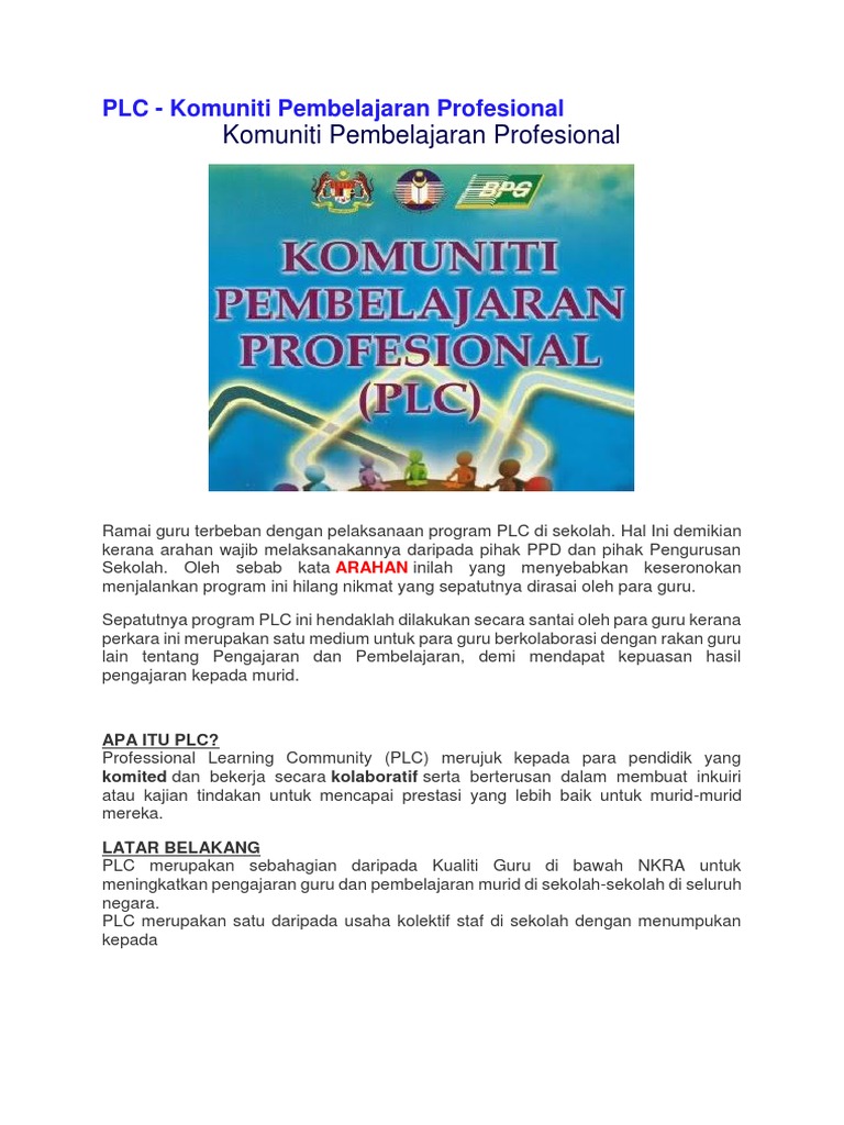 Professional Learning Communities PLC PLC ialah singkatan kepada program. Plc adalah singkatan kepada program profesional learning communities yang.